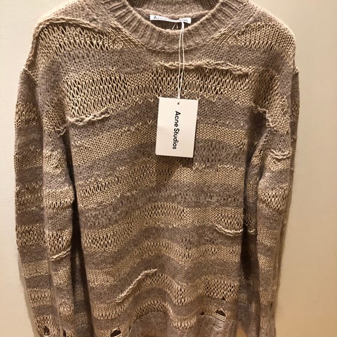 Små flekker på framsiden av genseren som er «misfarget» av ukjent årsak. Ikke veldig synlig, men i dagslys syns de tydeligere naturligvis.