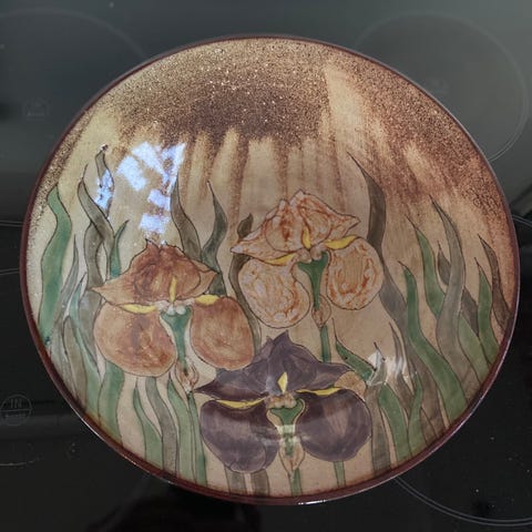 En artig skål med gøye farger og mønstre. Signert i bunn sv kunstneren Jorunn Ohnstad.