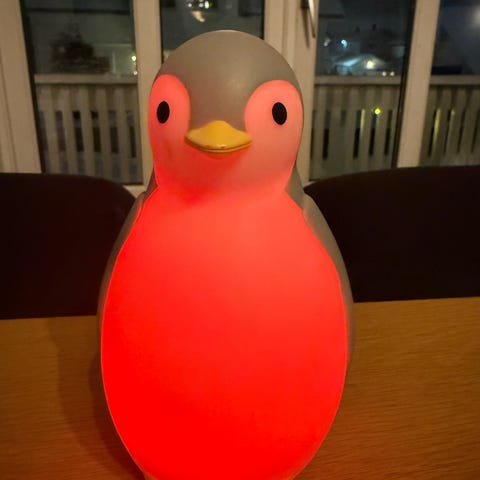 Skifter mellom 3 lys. Gult, lilla og grønt