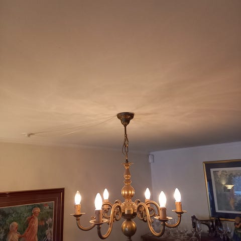 Lampen har 8 armer og er gullfarget. Ingen skader og fungerer utmerket.