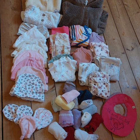 Klespakke for jente i str 56. Klær fra Newbie, Reflex og noen klær kjøpt i USA og England. Pakken inneholder: