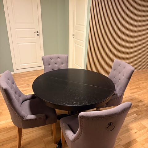 Spisebord / glassbord i smijern med glasstopp og ben av bøk. 4 stoler.