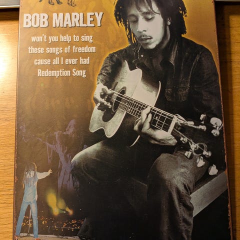 Bob Marley retro fototrykk. Trykt på finerplate og lagt resin over. Hull til oppheng bak. Ca 23,5 langt og ca 17,5 bredt. Samlere av musikk, populær kultur, reggae eller kjente ikon. Vinyl. Vintage stil