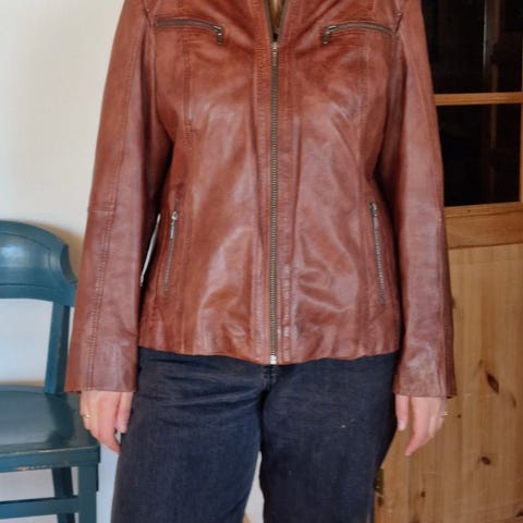 Pent brukt kunstskinnjakke. Kort modell, kule detaljer, bl a glidelås nederst på ermene.