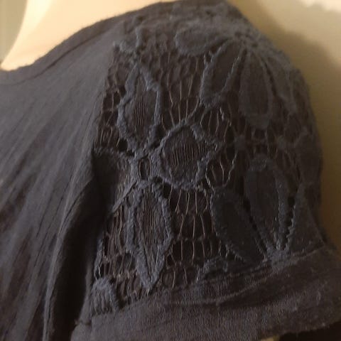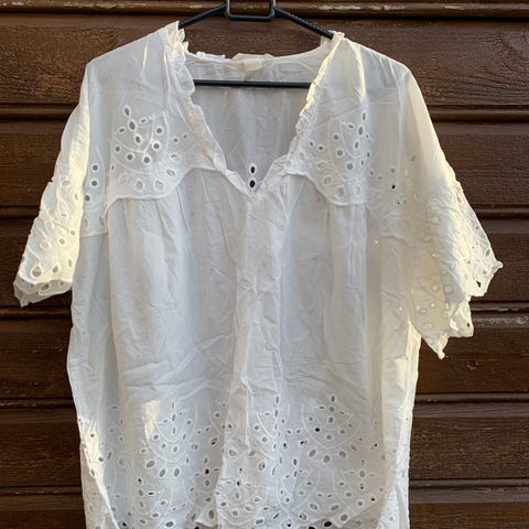 Nydelig, feminin, retro topp i bomull. Rett modell med båthals. Vakker på, kan også brukes i omsøm, innfelling til klær eller andre prosjekter. Veldig pent brukt, som ny. Kan sendes.