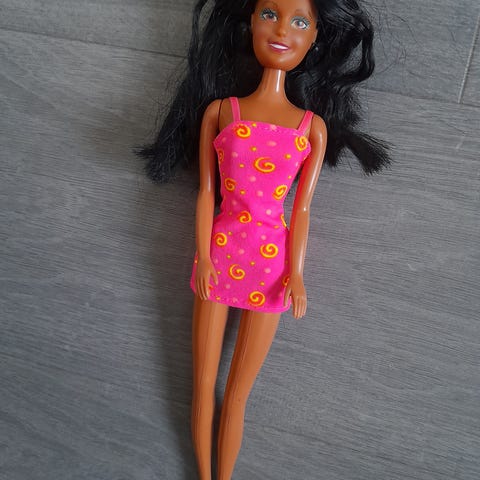 Merket av tidens tann, flekker her og der, men hel. Avskalling på ene øyelokket, se bilde. Soveøynene virker. Sko av plast/gummi. Kan tas av. Hatten kan gjøres om til flott parykk til Ken dukkens "Ken a go go" antrekk, som nesten alltid mangler parykken😁kan sendes, vipps, ikke helt hjem eller fiks ferdig