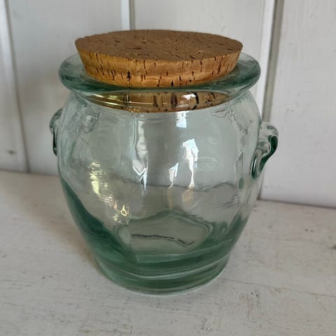 Kul glasskrukke med lokk av kork. Pent brukt.
