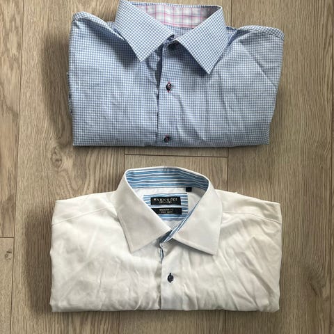 2 herreskjorter, brukte. Merker: 1 stk Collection -Classic fit str 47 cm. 1 stk. Alvo - non iron str 45. Pr stk kr 75