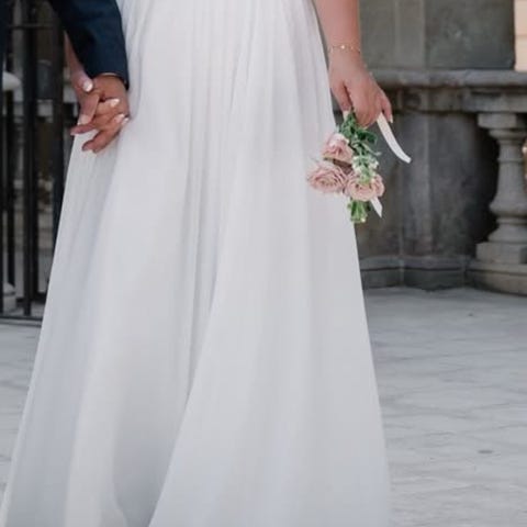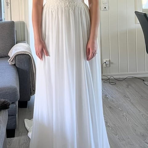 Brudekjole fra Sweetheart. Brukt én gang sommeren 2022. Passer S/M. Lagt opp til høyde 169 med ca 5cm høye hæler. Renset. Fin A-linjeform, blondeoverdel med sommerfuglrygg.
