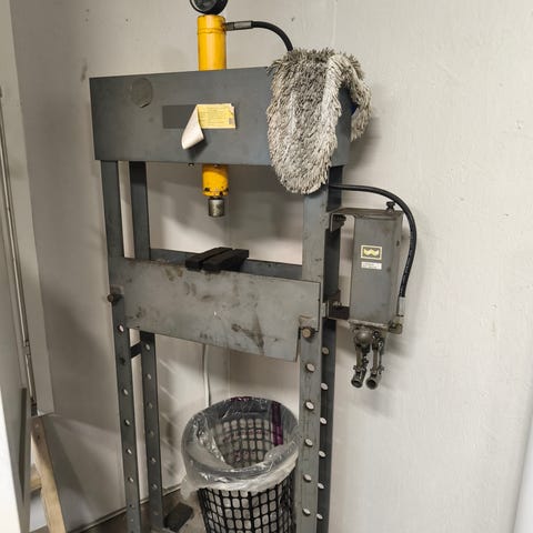Selve håndpressen forsvant i et konkursbo. Dette er kun de andre delene til pressen. Varmeelementet med kabel og holdere til caps og flate små deler - cirka 15 x 9 cm. ADKINS - engelsk presse.