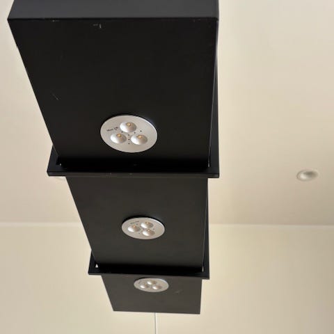 Lampa heng i ein stålwire. Leidning i svart og grått.