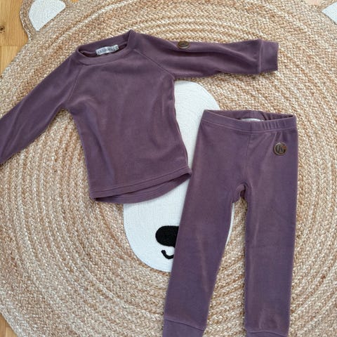Body, genser og bukse i 55% merino (ytterlaget) og 45% polyester fra Vill. Bruksmerker: body har et lite hull ved halsen, se bilde.