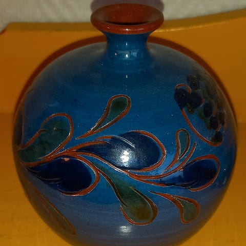 Blå keramikkvase med nydeleg blomstermotiv i gulgrønt og blått.