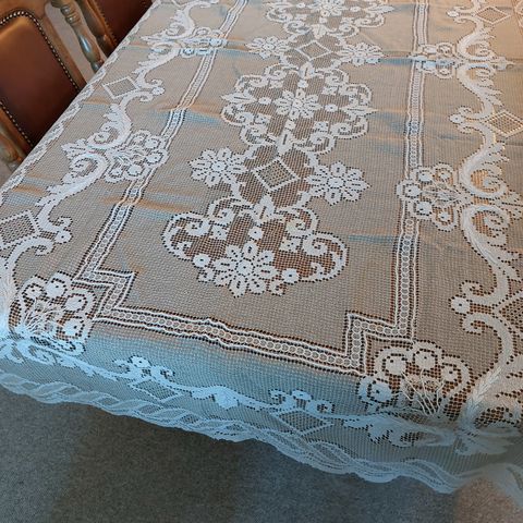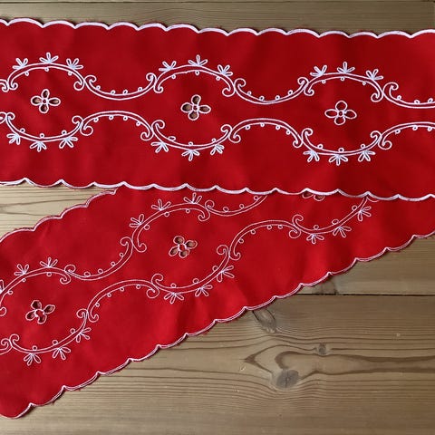 bordpynt borddekorasjon design dekor interiør pynt motiv retro jul juletekstiler lang hvit mønster roser blomster rosemotiv blomstmotiv blomstermotiv lang avlang spisestue spisebord dekorativ duk gave presang kjøkken kjøkkenduk bord rektangel rektangulært tekstil stoff hvit gjenbruk flergangsbruk koselig vintage kaffeduk retroduk nostalgi landlig landliv hytte hytta utendørs innendørs påske påskeduk bølgete broderi brodert brodering tynn