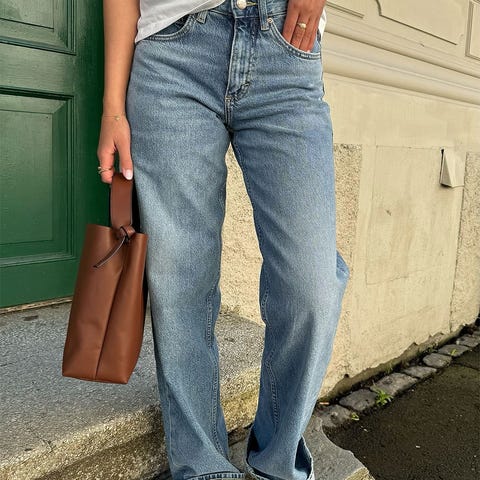 Skjørtet har midi-lengde, fem lommer, høy midje og beltehemper i linningen.