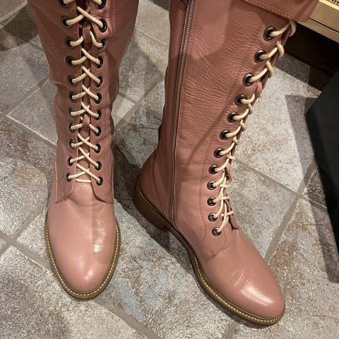 Skikkelige gummisåler og hel, semsket grått skinn. Gummi som gir god bakkekontakt på glatt underlag. Snøring på to måter, enten ved ankelen eller høyere med hempe. Unike designsko.