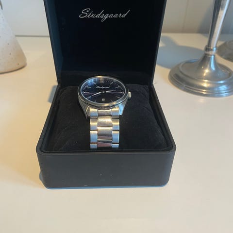 Pen klokke med tydelig urskive og strass på lenken på hver side av urskiven. Damemodell. Ekstra ledd følger med. Garantibevis og eske, med oppbevaringpute. Pent brukt.