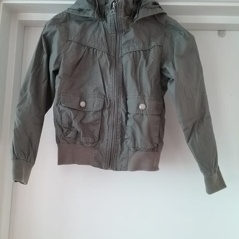 Meget pent brukt jakke i grønn militær bomull. Str. 140, foret med et kult blomsterfór. Tøffe detaljer. Passer bra vår, sommer og høst.