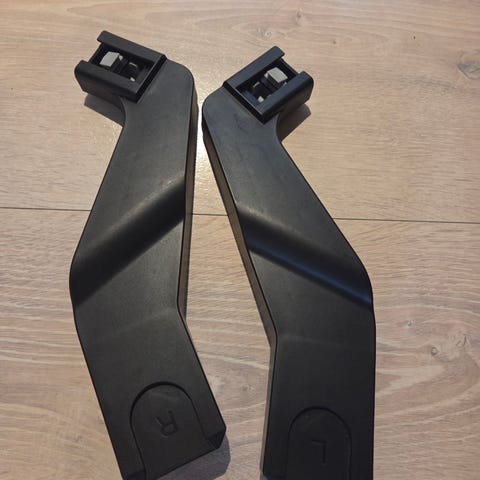 Dette er to gamle adaptere, jeg vet ikke om dette prinsippet fortsatt brukes av noen barnevognmerker. Se på bildet og ta kontakt hvis du tror de kan passe til vogna du har, så kan jeg ev. sende mer info.