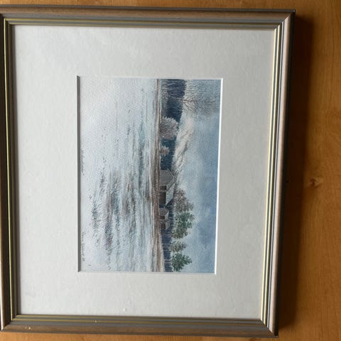 Nydelig bit av Sørlandet! Hus og sjøboder av gips som er malt og montert på rekved. Ca str. 6 x 35 cm. Nydelig stykke kunst av Åse Sandvikmoen fra Møvik i Kr.sand. Hentes eller sendes for kjøpers regning.