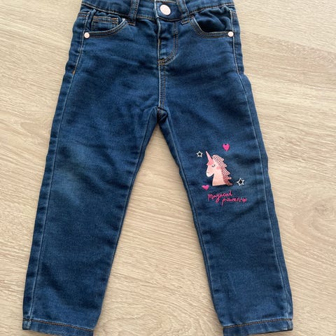 Selger ett par jeans med en reparationslapp på ena benet. Köpt på Lindex.