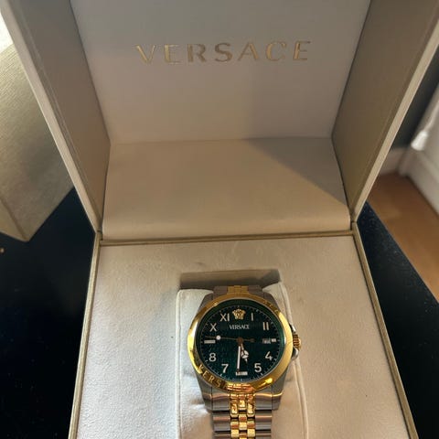 Nydelig Versace klokke selges. Sveitsisk urverk med ekte skinn reim og safir glass. Fremstår som ny selges komplett. Nypris 8400kr
