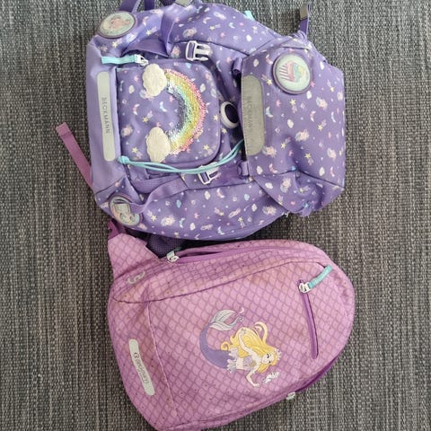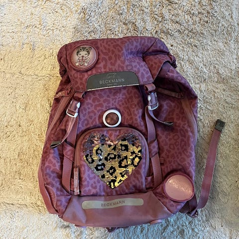 Godt brukt Beckmann skolesekk. Grønn med dinosaur trykk. Merker og regntrekk følger. Lyset på sekken fungerer ikke, mulig det er batterier som må skiftes??
