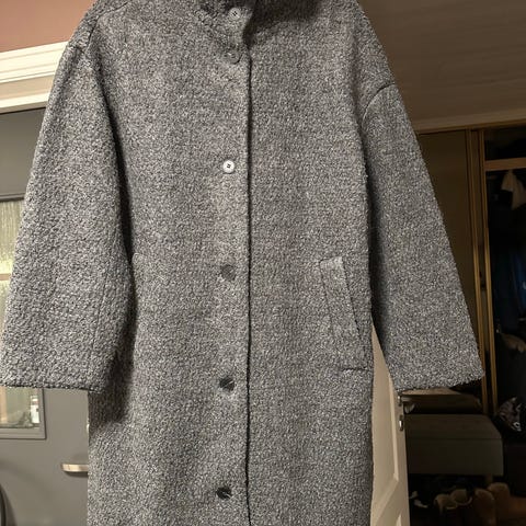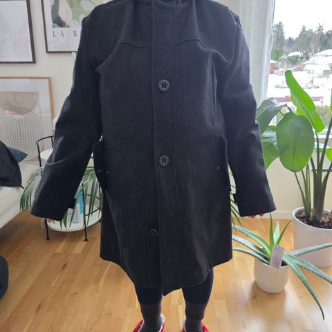 Svart, ullmix, midi, kåpe med rund hals, lommer og kontrastsømmer på ermer, ned rygg og ved lommer. 4 knapper. 50% ull, 50% polyestrer (for i polyester).