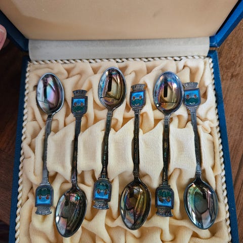 8 stk teskjeer i sølv med forskjellige byvåpen i Norge. (Steinkjer solgt)