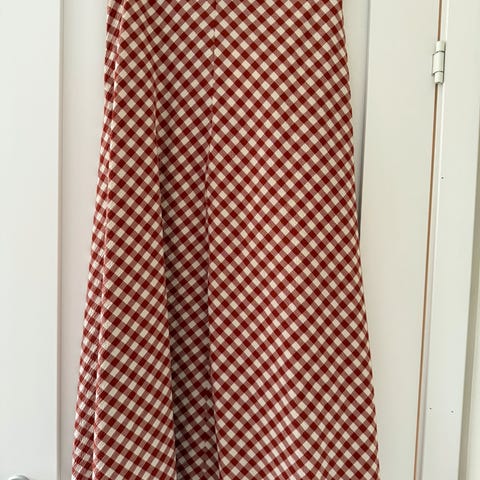 Skjørtet er av noe eldre årgang….til deg som ‘kjører’ din egen stil👌. Livvidde er 70cm og lengden er82/85cm. En original ‘finesse ‘ på fallen!! Skjørtet er i en ullblanding, 55% ull, 35% polyester, 10% mix.fiber og det er helfóret. Stor og ‘løs’ utenpå-sydd lomme. Et lite bærestykke over det rynkefrie skjørtet m/ god vidde. Fargen er rødt, vevd m/sort og røde og sorte striper som danner ruter. Kan vaskes på 30 grader👍. Frakt m/Helthjem kr 80,-.