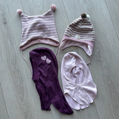 Seks luer, buff, hals, sett med skjerf og vanter, og hansker, svarte vanter