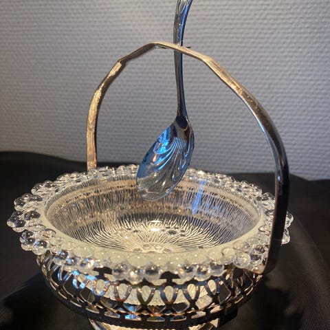Vakker, Vintage sukkerskål med hank/kurv og skje