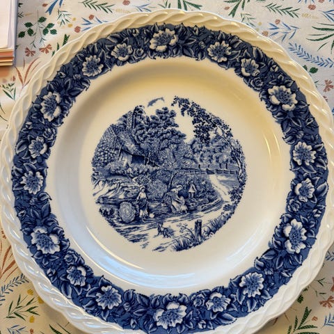 Hel og fin tallerken uten nagg eller krakelering. 24,5 cm dia. Nydelig - litt lys blåfarge m koselig motiv.