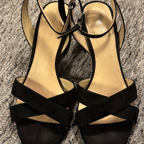 Pent og lite brukt sorte pumps med gullkant på stiletten. Selges da de dessverre er for høye for meg. Skopose medfølger.