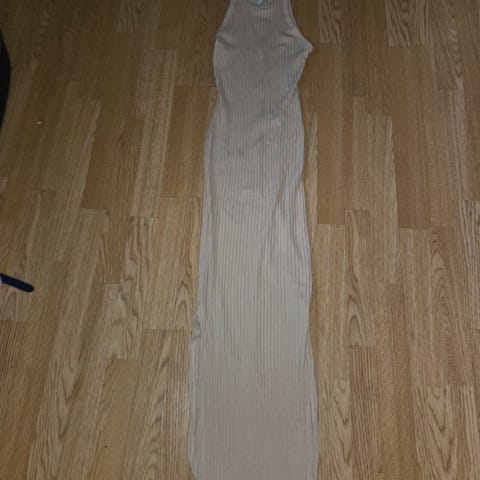 Nude kjole med fine detaljer på den ene skulderen.
