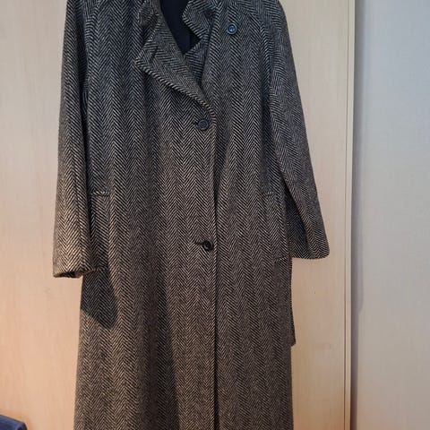 Helforet sort/mørk grå kåpe i ull,klassisk rett modell med krage og oppbrett ermer.