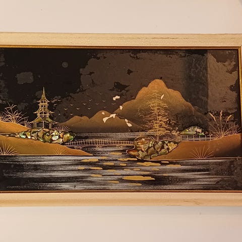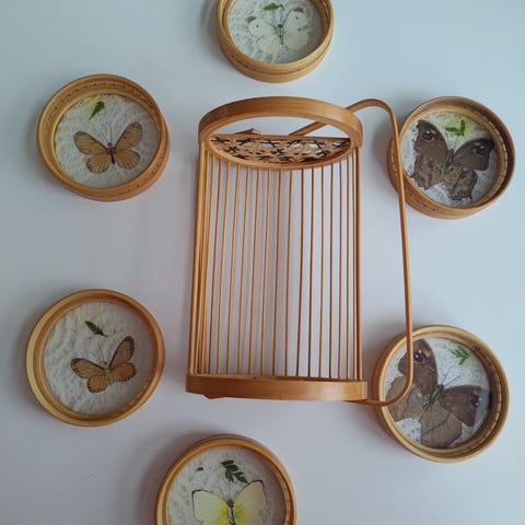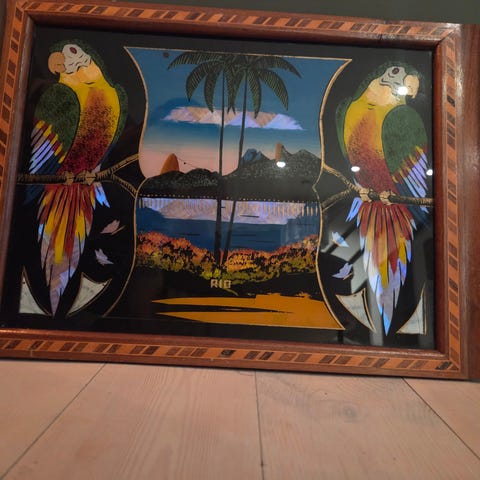 Vintage brett med dekor av ekte sommerfugler. Trolig suvenir fra Brasil. Rundt kanten er intarsia innfelt. I god stand foruten at glasset ikke når helt ned i et hjørne. Se bilde