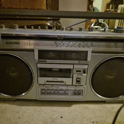 Genuin sjanse, hadde du mye penger på 70-tallet,så kunne du unne deg denne. Strikk på kassettspiller må sikkert erstattes Er koblet til stereo gjennom hengslene, kan også kobles over ledning, hvis du vil hekte av høyttaler nr 2. Selges ikke under prisforlangende. Som du ser i annonsen, så er alt tilbehør med. Urørt...