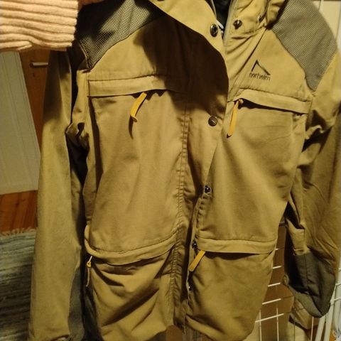 Størrelsen er unisex str S. Tilsvarende str 38-40 i damestørrelse. Farge er mørkbeige. Store lommer.