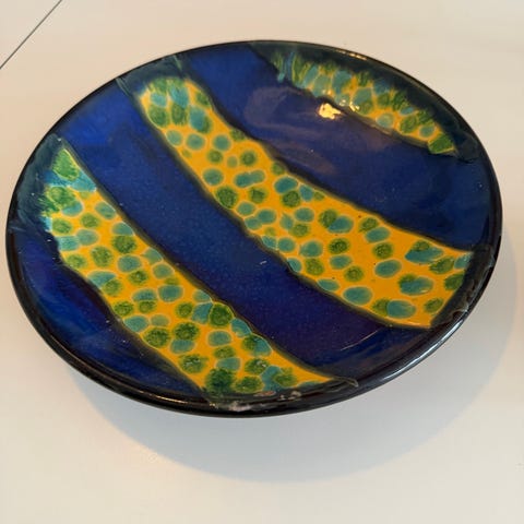Rundt fat i sort og gull. Diameter 39 cm høyde 9 cm. Lite brukt og har stort sett stått pent i et skap. Ingen sprekker riper eller skår.