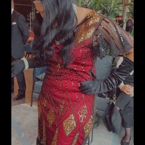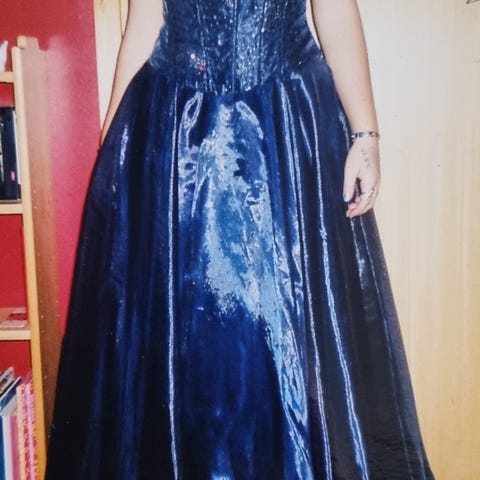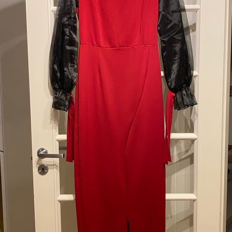 Kjolen ble kjøpt på Haraldsens kjolebutikk i Oslo i 1990, innkjøpt i anledning gardeballet på senhøsten dette året. Etter dette ble den kun brukt en gang til, på russeball i 1991. Har hengt i skapet siden, pent innpakket i en kjolepose. Den er like pen som den var ny, om enn ikke like moderne. Ingen hull, flekker eller skader. Kjolen har svart overdel i fløyel, en lang arm på venstre side, bar skulder på høyre siden, helt i tråd med trenden den gang. Glidelås i ryggen. Skjørt og overdel henger sammen, sømmen går litt skrått ned over ene hoften. Rødt skjørt i luftig polyester med stor vidde. Tyllskjørt under for å gi et luftig og brusende skjørt. Kjolen er fotsid. Kjolen har en stor avtagbar rød sløyfe med strasspynt som er ment å henge over skulderen. Festes med et sting eller en sikkerhetsnål. Kjolen er tilpasset til en med høyde cirka 170-175, litt avhengig av høyde på skohælene. Kan nesten garantere at du gjør lykke på festen hvis du møter opp i denne kjolen🤩. Jeg kan sende den, eventuelt kan den overleveres i Oslo sentrum etter avtale. Kan prøves i Ås før kjøp.
