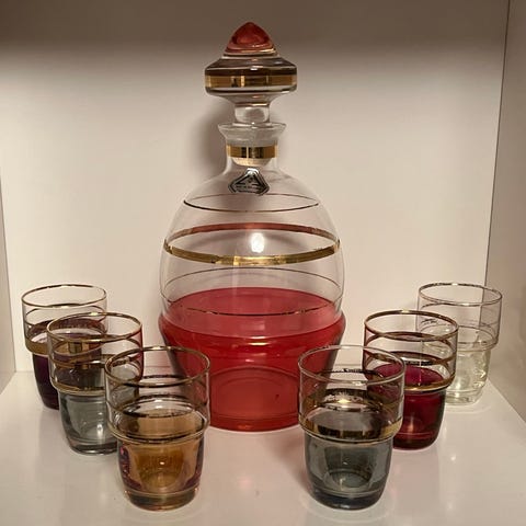 Gammel shaker eller karaffel i glass med 5 matchende små glass.