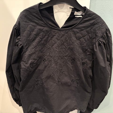 Blusen har et par små knapper på venstre skulder, en liten splitt og knyting nederst på hver side, vide armer med volanger nederst.