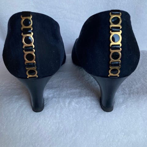 Litt utenom det vanlige slingbacks i sort sateng besatt med perlebrodert bånd foran og bak. Helhøyden er 10cm men med oppbygd platå på 3cm utgjør helhøyden 7 cm som gjør at skoene er superbehagelige i mange timer. Skoene ble kjøpt i Singapore i 1994. Etikett inne i skoen fremgår med merket Linea Carlo Italy. Brukt få ganger men dessverre litt for små til meg. Vil passe str 36-36,5. Anbefaler ar det legges på halvsåle. Skambud besvares ikke.
