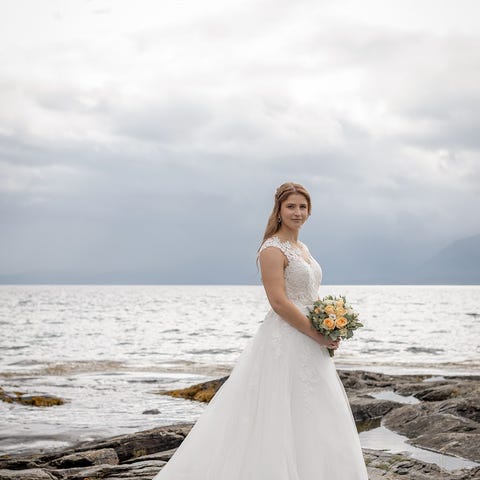 Nydelig, elegant og lekker brudekjole fra White One Bridal. Kjøpt på Wrights brudesalong i Tromsø. Deilig kreppstoff. Kritthvit i fargen. Modellen heter Fiana. Pent brukt en gang, renset kort tid etter bruk. Liten flekk på underkjolen, vises ikke. Kjolen er kjøpt i størrelse 38, tilpasset til å passe en 36. Flott snitt i hals og midje. Jeg er 174 høy og hadde ca 4 cm hæl. Kjolen er fotsid og tettsittende, smal i fasongen. Man får en flott havfrueform og det er likevel enkelt å bevege seg. Kjolen har litt slep. Kjøpt ny for 17500 kr. Enkelt brudeslør kan følge med. Send meg en melding om du har spørsmål. :)