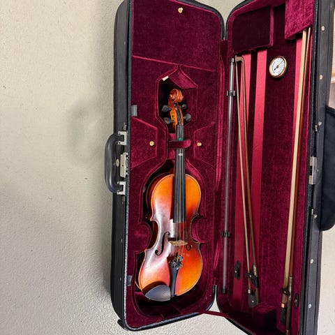 Fiolin kjøpt i en musikkbutikk i 2020. Brukt av sønnen min til han vokste fra dem og begynte å bruke andre, større. Så satt de i skapet fordi vi håpet datteren vår skulle spille dem, så vi ventet på at de skulle vokse, men hun begynte å spille piano i stedet, så jeg antar at noen fortsatt kan bruke dem.