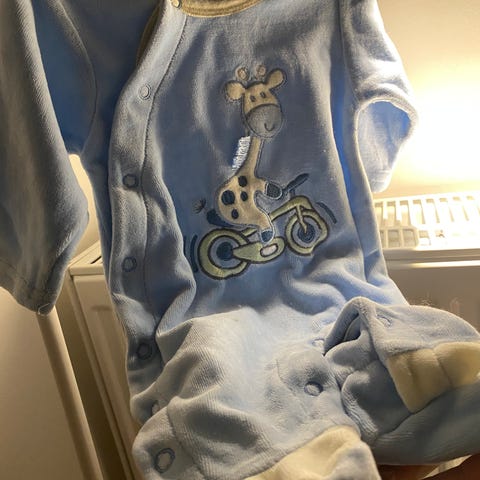 Helt nydelig dress til babyen- myk og deilig å ta på-og ha på. Hette og knapper over hele. Enkelt å skifte bleie mm.