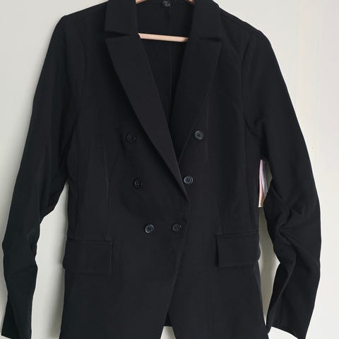 Sort blazerjakke/kåpe fra H&M, str. 36. Jakken har belte i midjen (kan fint brukes uten) og er noe innsving i midjen. Lukkes med doble knapper som er skjult. Lommer i sidene. Pent slag nederst på ermene.