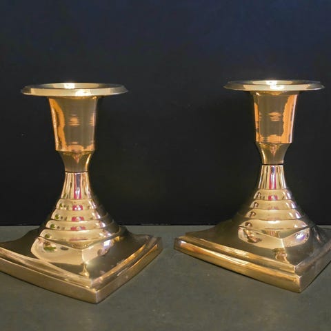 Gode 1900 -talls kopier av 1700-talls utgaver. Dette er fint gjørtlerarbeid og jeg vil tror de er laget på en av de mange dyktige svenske messingbrukene. Mål Høyde ca 21 cm.. Det er lov å spørre på pris.