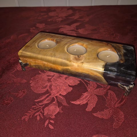 Kjenpekule lysestaker i 10x10cm gammel bjelke med hestesko og flattstål.